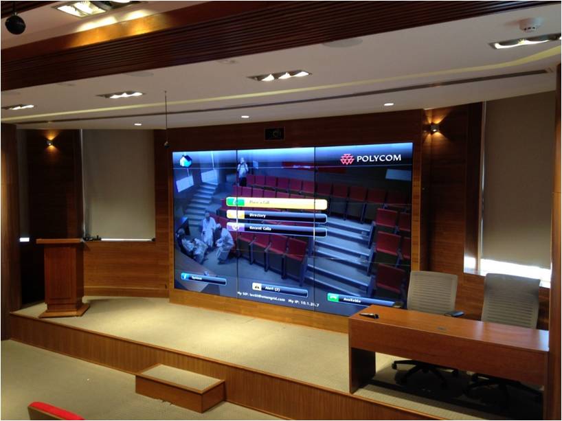 Replacement of old 65” Consumer TV with 180” Video Wall, integration of existing Cisco Video Conferencing, Complete cladding matching the existing interior